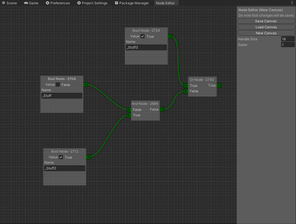 The next step was to add some logic and the ability to save graphs into a data structure. For the data structure I decided on ScriptableObjects as they are native to the Unity ecosystem and can contain both logic and data. Which lead beautifully into creating a simple logic system where you can program with boolean logic and define variables. One of the requirements.